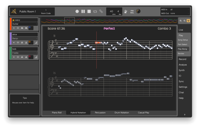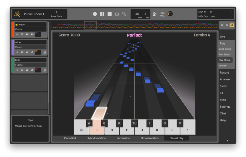 可以任意地將任何 MIDI 歌曲轉成音樂譜,在線上空間中自由的創作跟演奏
