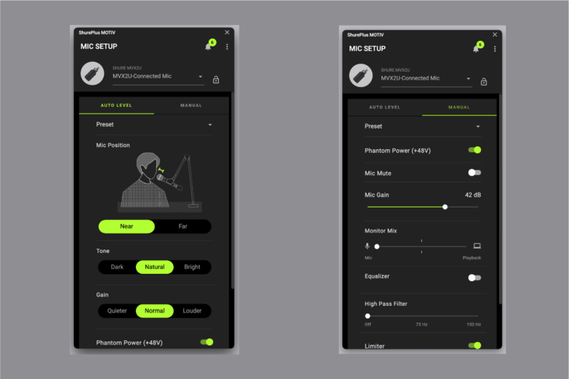 ShurePlus MOTIV™ 為一款免費的 APP ,能夠針對 MVX2U 上的音訊做進一步的控制