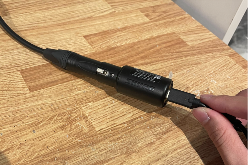 這一次我們連接的是 Shure 自家的經典動圈麥克風 SM7B ,這邊值得一提的是,其實無需再外接 XLR 麥克風線材即可使用,不過因為我們實測中使用的電腦主機離桌面有些距離,因此我們新增了一條 XLR 線材以確保不會拉扯到麥克風。