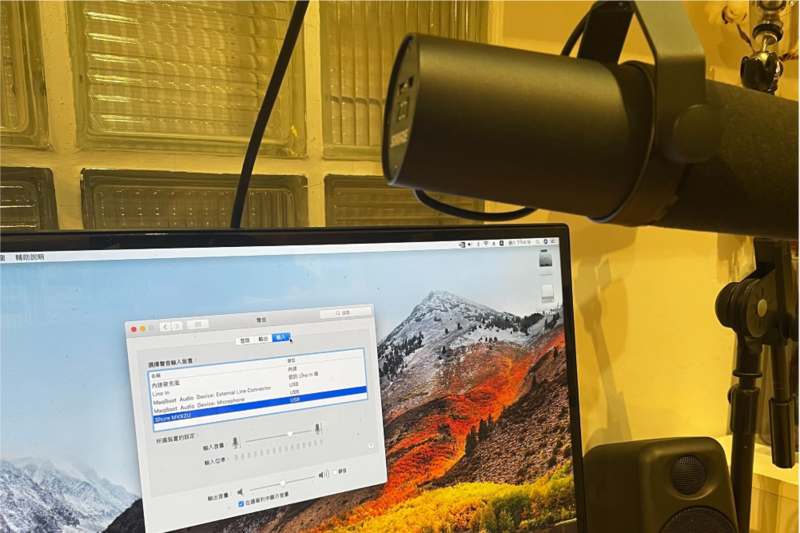 在街上電腦後,馬上就可以看到有聲音輸入了,音訊設定的介面馬上就可以看到 MVX2U 輸入了!我們可以直接從 MVX2U 本體接上耳機來進行監聽。