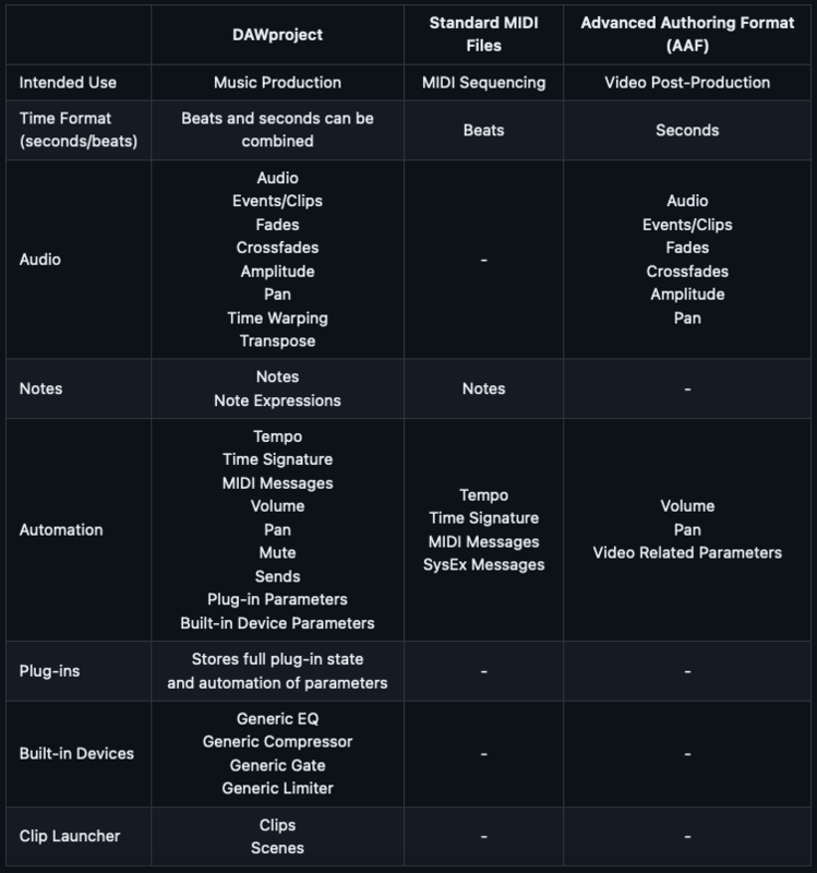 傳統的交換格式,如 MIDI、AAF (Advanced Authoring Format) 或 OMF (Open Media Framework),雖然在音訊和 MIDI 資訊的轉移方面具有一定的功能,但 DAWproject 可能將走得更遠。它不僅包含了 MIDI 音符、音訊剪輯、淡入淡出、音量和平移等編輯資訊,還加入了時間調整、變調、MPE、標記和混音自動化資料等。更重要的是,它能夠保留任何已加入的 Plugin 的完整存儲狀態以及它們的所有自動化資料,即使是那些無法轉移到其他 DAW的內建 Plugin 也將能以通用形式取得數據。