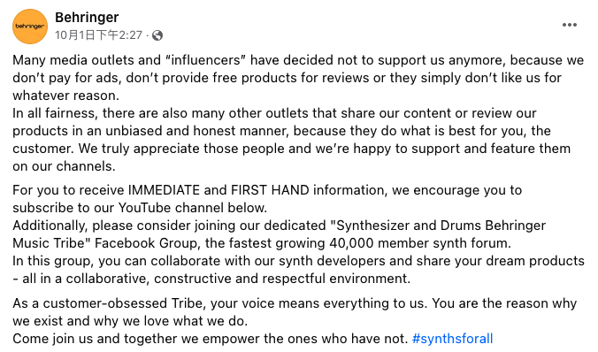Behringer 沒有明確說明所謂的 “免費產品” 是什麼,但在音樂器材產業或許多其他產業中,品牌公司通常會將設備「暫時」借給相關媒體,以便進行獨立的測試和評論。該公司也沒有具體指出哪些 “媒體和網紅” 不再支持它,也沒有提供任何證據來支持其說法。Behringer 建議,要獲得有關其產品的“即時和第一手資訊”,最好的方式是訂閱 Behringer 自家的 YouTube 頻道,因為它們可以完全控制編輯內容。