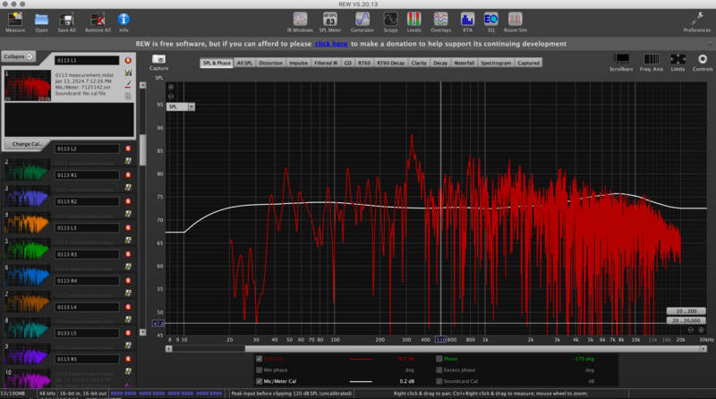 將 SPL 曲線上的選單呈現選到 All SPL 可以得到如下圖般多次掃描的所有結果疊加,這邊我們疊加了一共 10 次的左右聲道 SPL 曲線。可以看出他們曲線走向一致,但並非完全重疊,且在低頻和高頻段有些許程度的出入。