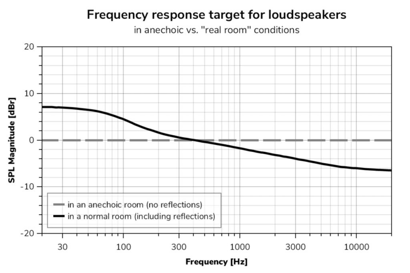 監聽喇叭若在一般家用空間使用的話,會因為低頻受到房間牆面或物體產生反射(低頻波長較長、不易消散而易在角落產生駐波)、高頻在空氣中傳遞產生衰減或被空間的材質吸收等情況,以上狀況會造成頻率響應曲線呈現低頻段略微隆起,而到高頻段緩緩下降,我們將曲線稱為 Room Curve,也就是我們期待喇叭頻率響應在一般房間能夠接近的目標曲線。