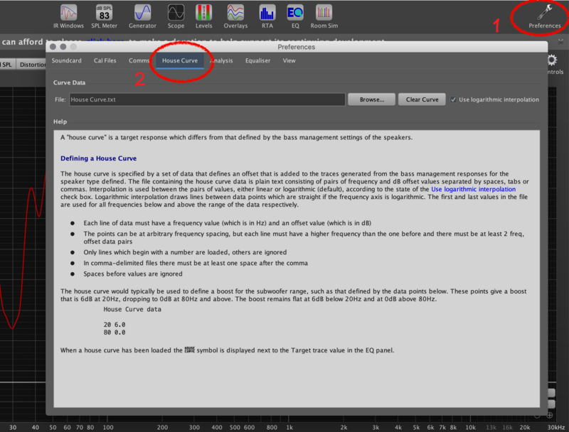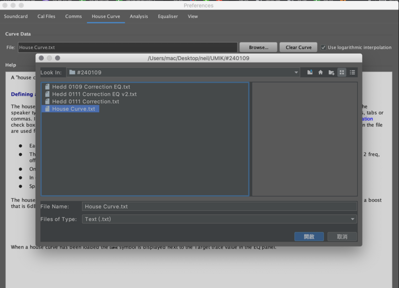 將以上數據貼進文字檔(.txt) 即可,接著如下圖所示在 REW 的 Preference 選項選擇 House Curve 並載入存取的這個文字檔當作我們的目標曲線。