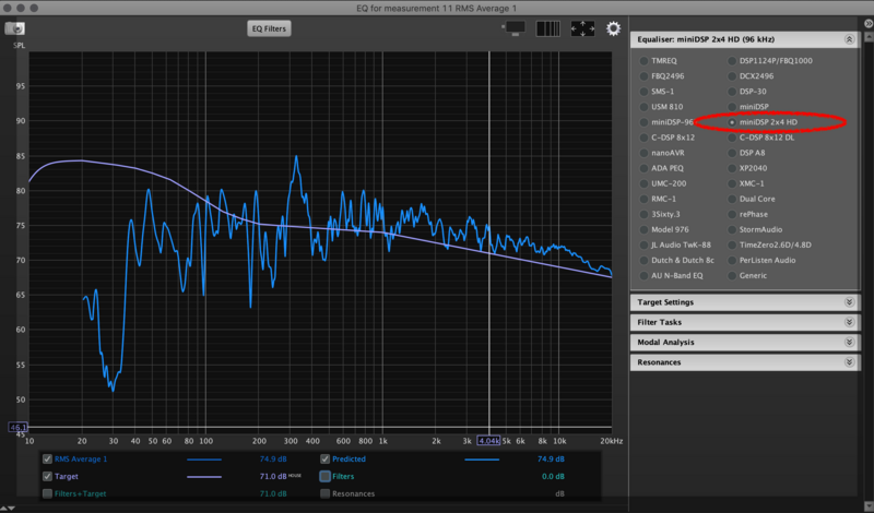 會出現如下圖的 EQ 視窗,我們可以利用右側的 EQ Filter 來做矯正,使得現有曲線更加接近我們目標曲線。由於我們待會要搭配的類比數位轉換裝置為 miniDSP 2x4 HD,因此在右側選擇它做為之後要套用 EQ 的裝置,這邊大家也可找找有沒有自己要使用的調音設備。