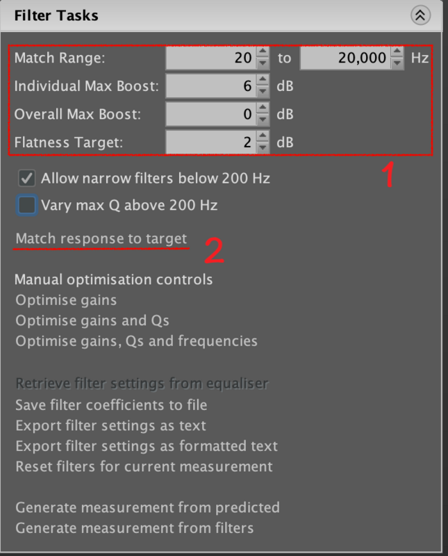 接著點開 Filter Tasks 將 Match Range 設為我們從量測階段就一直設置的 20 - 20000 Hz,然後調整單頻段 Max Boosr 和整體 Boost ,這邊的數值沒有一個標準參數,我們建議將 Indivisual Max Boost 調製 6dB,Overall 部分為 0dB ,Flatness 調整至 1 或 2 dB:此次目標是希望 EQ 幫我們做微調修飾不合理的區塊,但我們又希望在空間內能達到自然且不至於矯枉過正的結果,因此選擇以上較為和緩的數值來調整,當然您也可以多試幾組不同的數值推敲出最合乎自身聽感的聲音表現,一切都沒有標準答案。