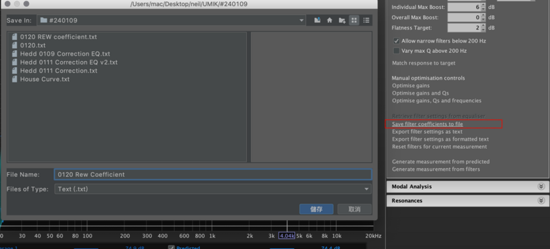 接下來,在右側點選 Save filter coefficient to file 將我們的 Filter 參數儲存下來以便之後使用 mini DSP 的 2x4 HD 來做 EQ 調整。