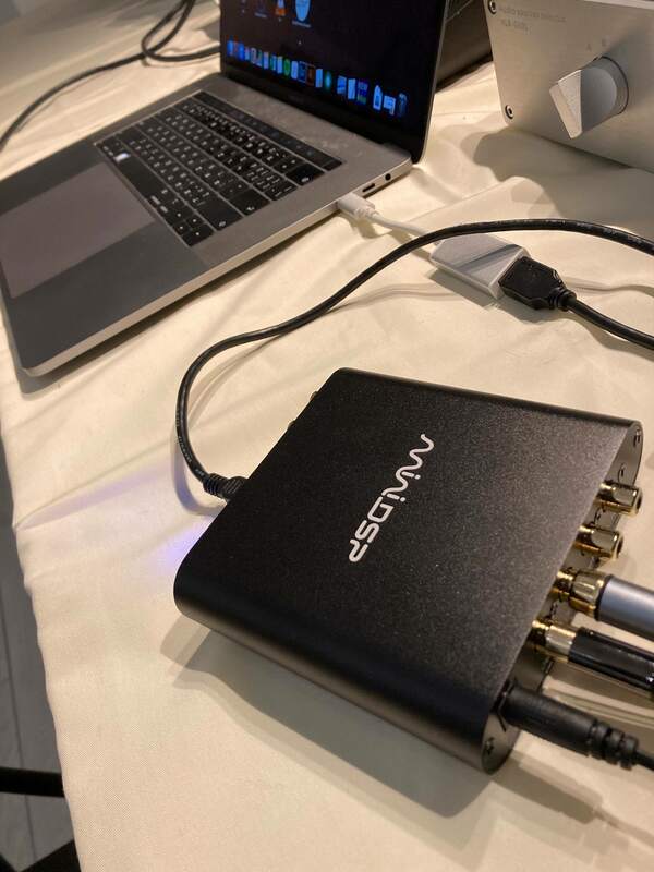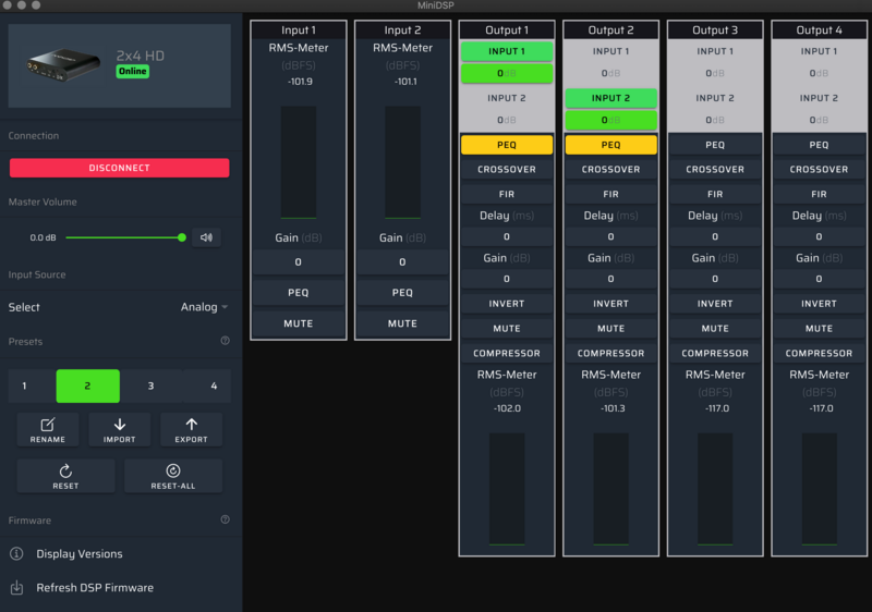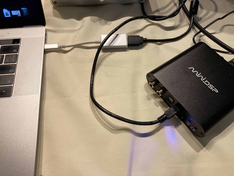 下載完畢後,可將 miniDSP HD 2x4 接上電源、與電腦連結並將輸出與您要的器材或喇叭做連結,如下所示。