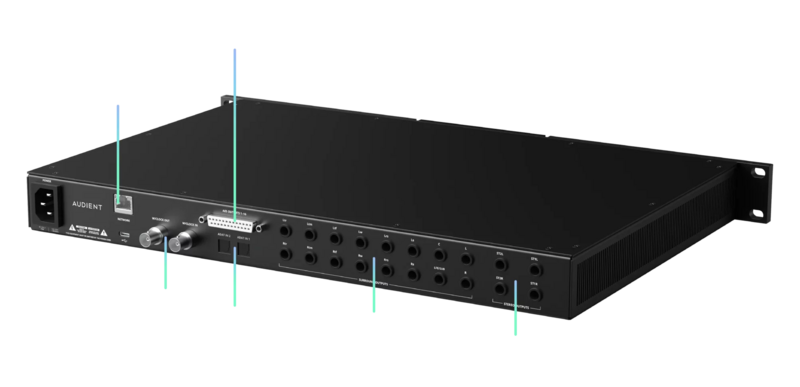 Audient ORIA 針對沉浸式音訊提供了豐富的輸出選項。除了兩個切換立體聲線輸出外,還提供了 16 個環繞聲輸出,可選擇類比或 AES 格式。還有兩個獨立控制的耳機輸出,並具備編碼的監聽組、單獨輸出或組別的靜音/獨奏功能、全球音量控制和全球延遲等功能。