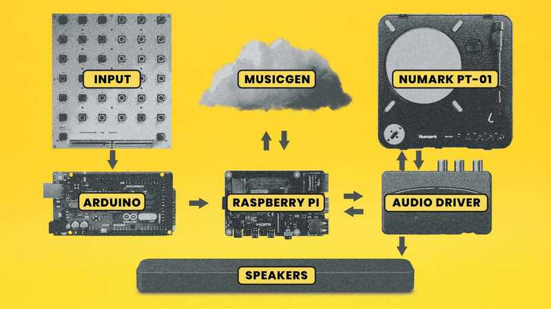 在技術層面,SPIN 運用 Arduino Mega 接收按鈕輸入,然後通過字串傳輸到 Raspberry Pi,觸發 MusicGen API。生成的 MP3 文件被載入到 DVS 中,透過改裝的 Numark PT-01 轉盤和時碼控制的唱片來播放。