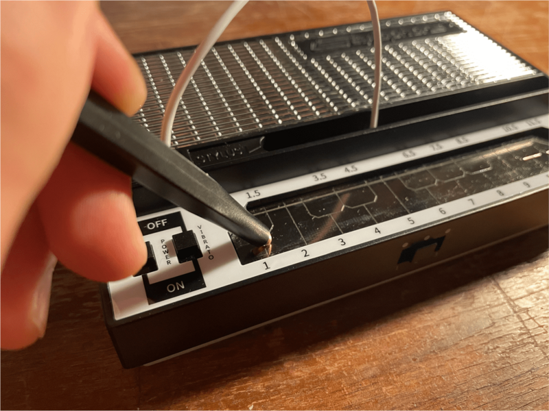 於是 Brian 開始讓他的想法成型,經過幾次實驗以及電路測試,他完成了一個簡單如玩具般的樂器,那是一個透過觸控筆在電路板上觸發聲音、以及一個顛音開關的迷你樂器,而後,他以觸控筆  “Stylus” 加上發聲 “Phone” 所組成的變體字命名其為 Stylophone 。