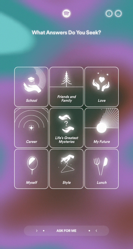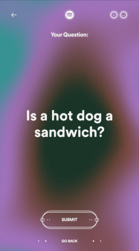 當你輸入問題後,「歌曲通靈」會要求你按住螢幕,然後畫面上會出現旋轉的顏色,同時播放神秘的音樂,之後你的答案將以一首歌曲的形式顯示出來。例如,如果你問某人是否對你有好感,它可能會以一首題為「你希望」的歌曲回答(哎呀!)或更肯定的回答。有些答案可能有點神秘,就像神奇 8 號球有時會以「稍後再問」來拒絕回答一個問題一樣,Spotify 的「歌曲通靈」也可能以它自己的方式回答,比如「為什麼?」而不是直接回答,或者它可能提供一個模糊的時間框架。