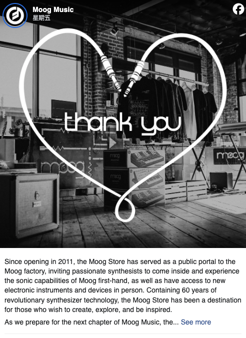 Moog 官方表示:「自 2011 年以來,這裡一直是通往製造工廠的大門,邀請世界各地的合成器愛好者親身感受 Moog 的聲音與最新的電子音樂設備。隨著下一步,我們將關閉 Moog Store。Moog 工廠會繼續營運,才華洋溢的工程師也會繼續手工製作樂器,我們將更專注地研發新一代合成器,並致力於發表更多經典的 Moog 產品。」
