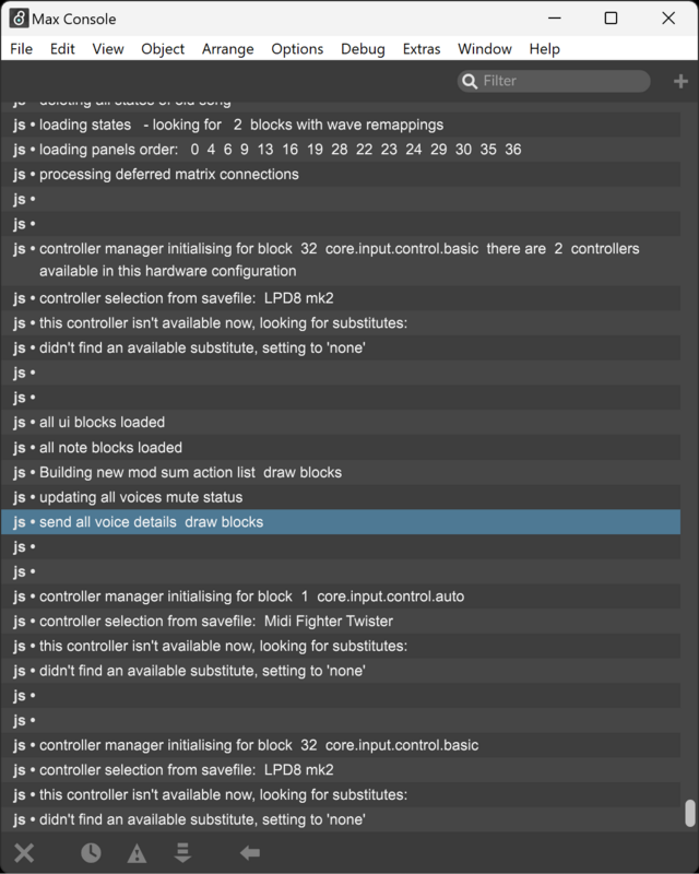 在 max/msp 控制台視窗裡,可以看到 benny 目前正在發生的事件資訊,如果出現任何問題,可以在這裡找到原因、一些有用的資訊以及解決辦法。
