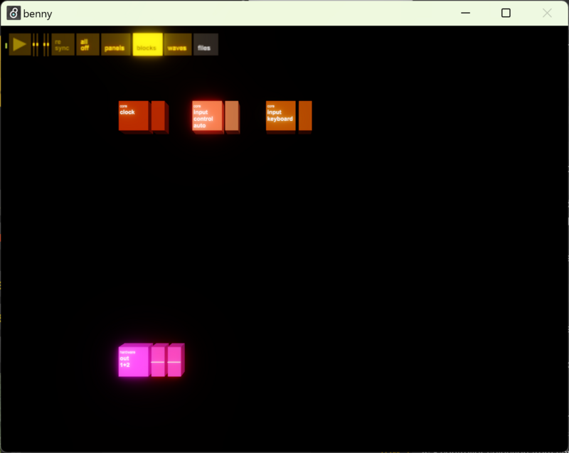 在 benny 的世界中,每一首歌都以積木化的模組構成,分別表示 midi 處理器、音訊處理器、連接到電腦的硬體裝置、或者其他控制速度或調音等等的系統。