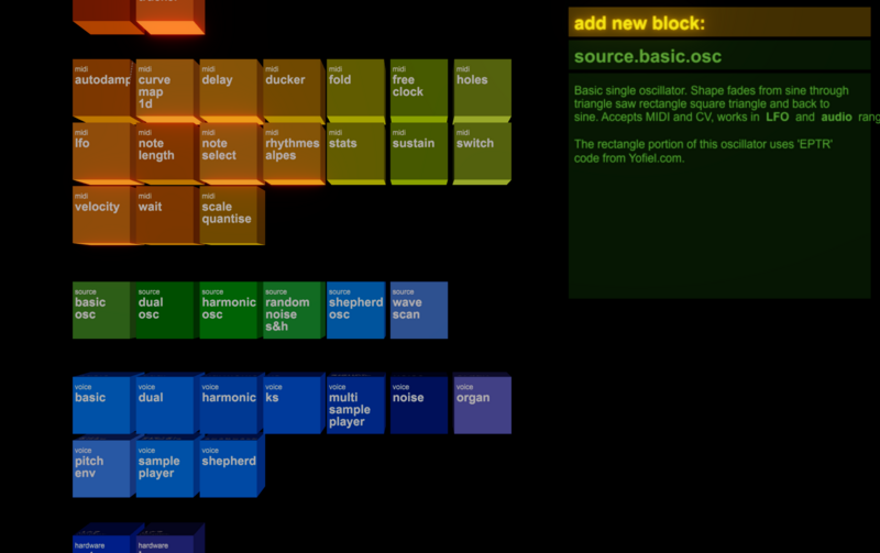 下面這塊積木是一個振盪器,擁有 2 個音訊輸入、2 個輸出、以及任意數量的 MIDI 輸入和輸出。