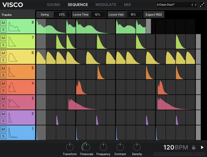 Visco 是一款擁有 8 軌 16 Step - Sequencer 鼓機,Step 的長度可以自行編輯,每一軌的音色可以按照自己的喜好做出設計。其 Pattern 擁有的 Swing / Shuffle 功能、Loose Time 調整以及單 Note 調整音量位置大小等,都能為你的 Drum Pattern 帶來不確定性,輕鬆做出富含有機感且韻律十足的節奏組。