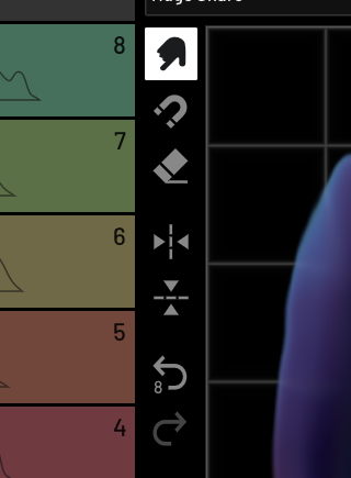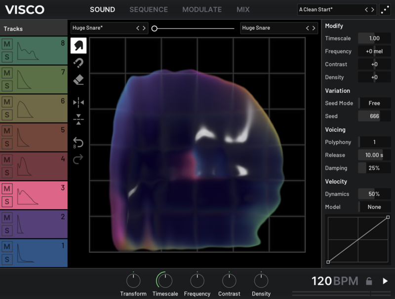 Visco 建構聲音的起始點是在一坨立體且帶有透明質感的團狀物,這塊團狀物及代表你的音色表現,在含有 X(頻率)-Y(時間) 軸的網格上來自由使用工具拖曳或是塑形你的音色。