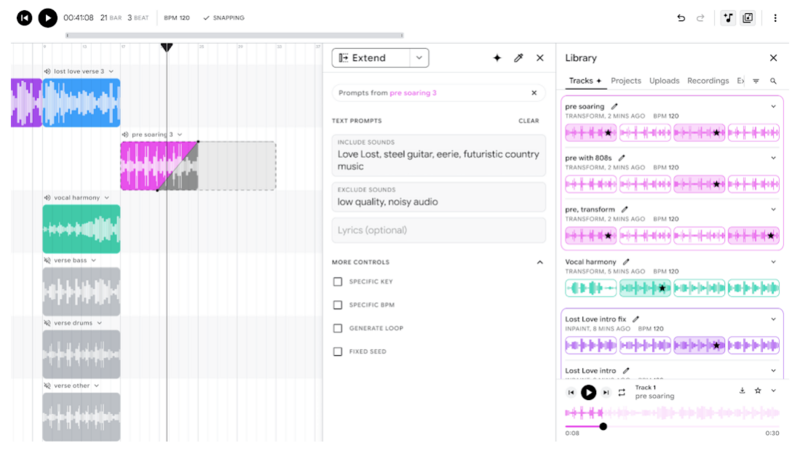 - 自動音樂生成:利用 AI 演算法分析使用者的音樂風格偏好,並在數秒內生成符合需求的音樂片段。從流行、搖滾到電子音樂,MusicFX DJ AI 提供的範圍極為廣泛。
