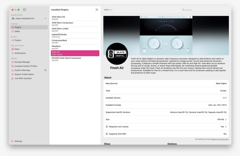 檔案散落各處,格式版本各異:Mac 上 AU、VST3、AAX 通常分別安裝在不同路徑;加上新版系統對舊驅動、iLok 授權方式的改版,光靠 Finder 搜尋很難全盤掌握。