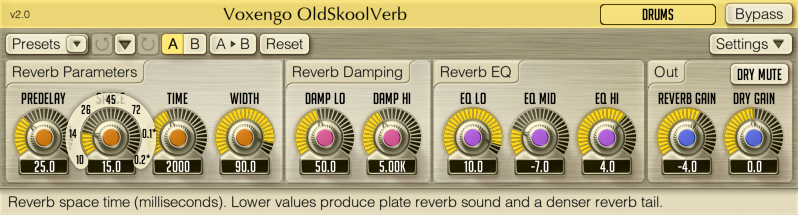 OldSkoolVerb 的聲音特色是以經典的 Stereo Reverb,舉凡 Plate 到 Hall 等效果使用起來都有一定的水準,但是可以客製化調整的參數就略顯得少了些(不過想到是免費的版本,就感覺已經相當不錯了!)。OldSkoolVerb 比較適合使用在非打擊類型的樂器上,像是人聲、鋼琴和 Pad 的部份。快試試看吧!