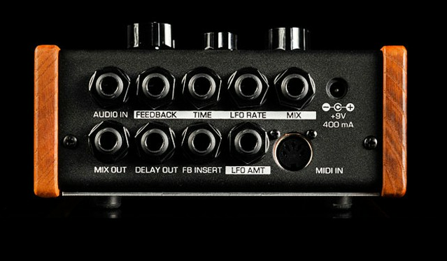 在背板的部份,依舊可以用 CV 控制 Time, Rate, Feedback, Amount, 和 Mix,也可以使用 Moog EP-2 CV 踏板控制。值得注意的是,新的 MF-104M 增添了 MIDI 控制,和其他樂器或是軟體控制都相當方便,MIDI In 也是前幾代 104 所沒有的。