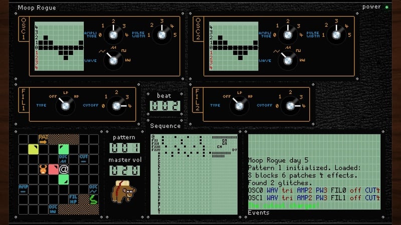 如圖,介面左下角是遊戲地圖,右下角是遊戲記錄,中下區塊顯示的是序列器,代表著現在輪到地圖上的誰移動:你(用 @ 表示)、怪物、或是效果(FX)。玩家藉由通過地圖上的特定效果格子,改變介面上半部合成器震盪器和濾波器的各種參數,來決定你的攻擊(或被攻擊)數值,當然也會改變聲音。遊戲目的是不要被怪物打死,通過一關又一關隨機生成的關卡。