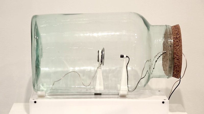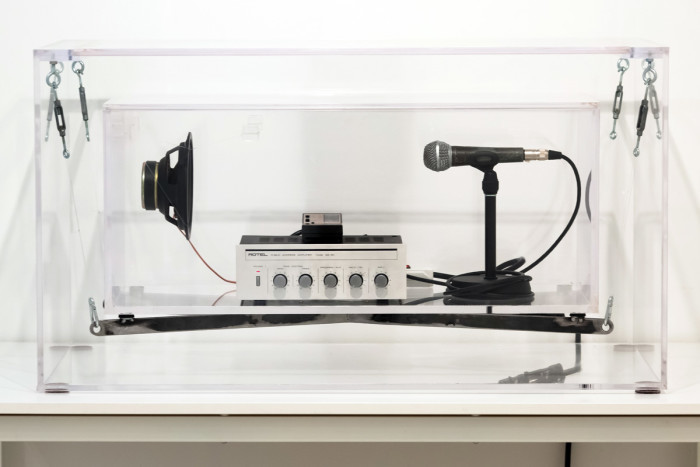 而 The Loudest Sound In The Room Experienced Very Quietly ( 最響亮的聲音在靜悄悄的房間裡 ) ,是一個隔音玻璃盒中放置了麥克風、揚聲器,和擴音系統中的擴大器。它們的配置造成不斷循環的無盡回授聲響。玻璃盒中的聲音分貝高達 120dB,和非常靠近的聽到汽車喇叭聲差不多,原本功能應該是用來向外溝通的擴音系統,現在卻反過來對自己造成混亂。