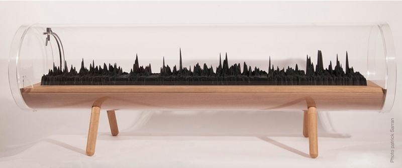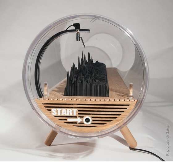 法國數位藝術家和「聲音雕塑師」Gilles Azzaro,將美國總統歐巴馬 2013 年演講的國情咨文,3D 列印成山谷形狀的瓶中船。最厲害的是,如果用鐳射光從頭到尾掃描這塊黑色山谷,你將會清楚聽見總統的字句箴言:「曾經是廢棄倉庫,現在搖身一變成為國家藝術實驗室。工作人員正在研究 3D 列印技術,一門擁有無限潛力的工藝,可能為我們製作所有東西的方式,掀起革命。」