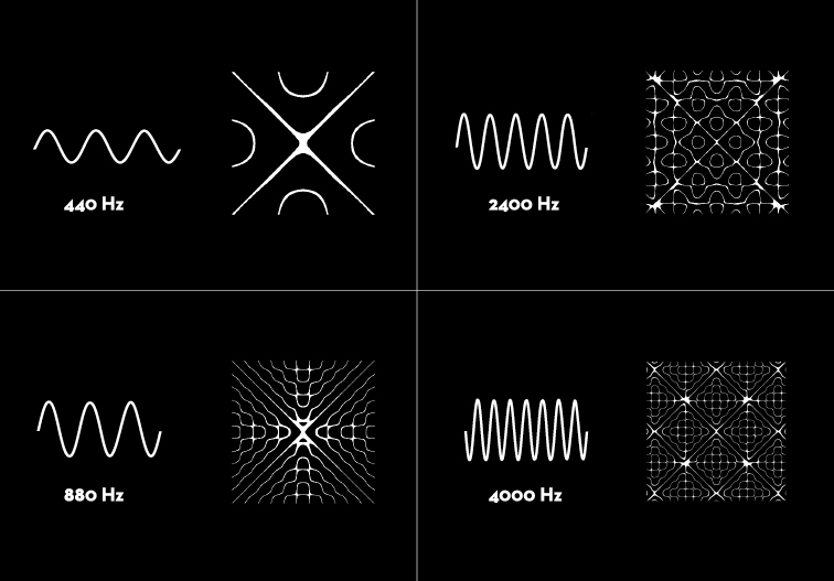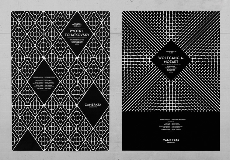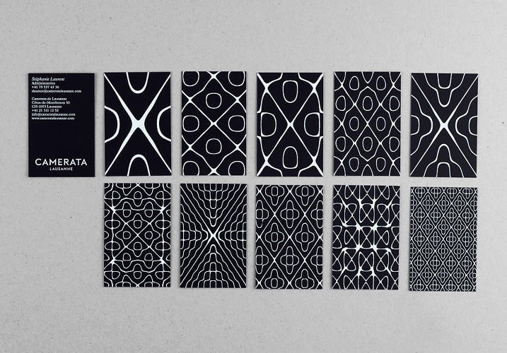 瑞士設計師 Demian Conrad 幫洛桑的卡莫拉塔交響樂團(Camerata Orchestra)設計形象視覺。Conard 想要營造奇異的音樂氛圍,同時避免太過精準的繪圖。於是他靈機一動,想起已有 200 年歷史的聲波實驗「克拉尼圖形」。克拉尼圖形由德國物理學家 Ernst Chladni 發明,他在小提琴上撒上沙子,然後用琴弓拉小提琴,結果這些細沙自動排列成美麗的圖案,並隨著演奏曲調頻率的不同而變化。Conard 用電腦程式模擬克拉尼圖形,創造出一系列結合樂團標誌的黑白圖案。
