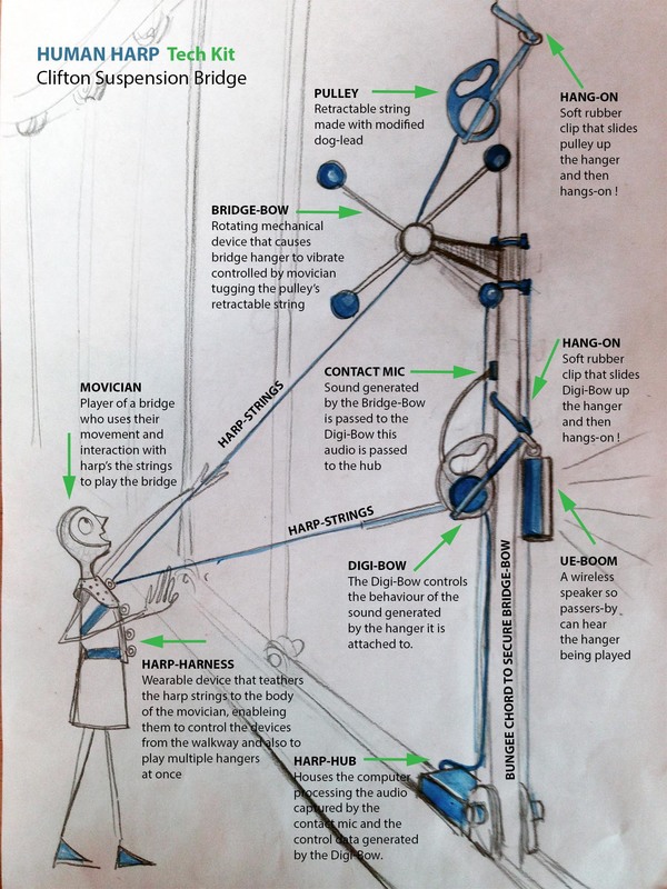 Di Mainstone 解釋了她是如何使用附著在吊橋上的裝置,來讓肢體和橋產生連結並且發出電子聲響。人體豎琴這項新媒體裝置主要建構在一些小小的附著在吊橋的裝置上,下面有一些關於這個裝置的簡易結構: