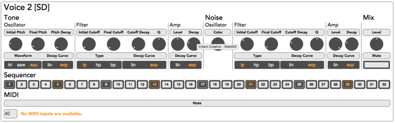 熟知合成器的朋友看到 WebX0X 的朋友,可能可以很快地聯想到 X0X 是模仿 Roland TB-303 的復刻機種,因次不意外的,這套線上合成器鼓機的設計靈感,正是以 80 年代 Roland 的 TR-606, TR-707, TR-808 和 TR-909 為靈感所設計。WebX0X 像 606 和 808 一樣,聲音都是由簡單的震盪器、噪音產生器、濾波器和 Envelop 所發展而來,並且有 Sequencer 等控制功能,相當方便編輯節奏。