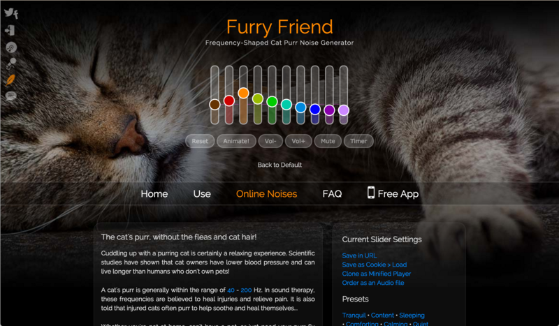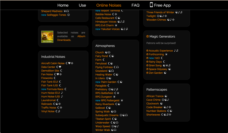 除了黑膠噪音,MyNoise 也提供其他免費的線上工具或 App,可以生成各式各樣的背景音,種類不少,還有許多神奇的分類,自然聲響、合成器噪音、腦波、工業噪音、魔法、貓咪呼嚕(酷!)......,全都是免費的素材!