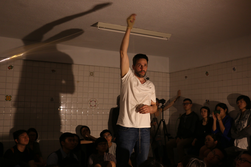 Jean Francois Laporte 為加拿大籍藝術家,聲音裝置以氣聲共振原理為創作主軸。本次 The Flying can 裝置透過旋轉與接觸空氣產生震動,視空間需求與身體尺度而異,進而產生各種頻率。