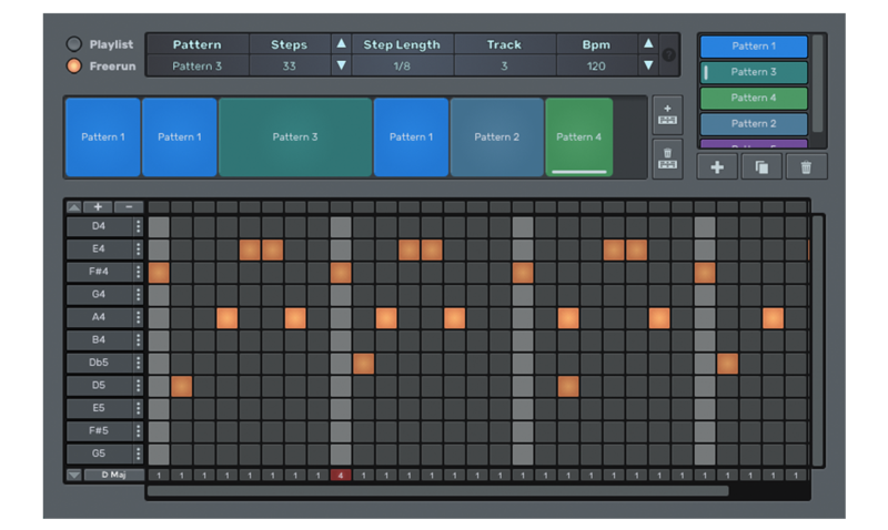 Step Sequencer : 新的 Step Sequencer 將讓使用者快速的創作一個 beat、sequences、或是琶音...。再搭配內建的 pattern 將快速的寫出好聽的歌曲動機、旋律線、和弦行徑
