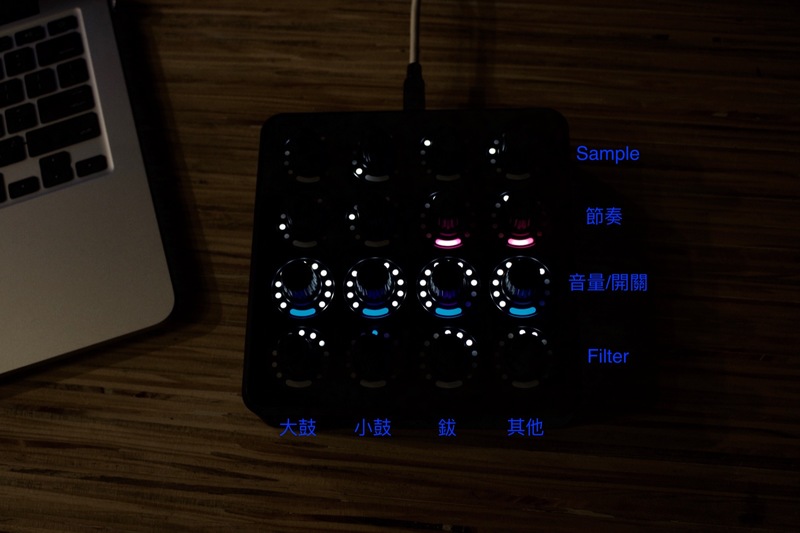 這次主要試了一個功能是他的四軌 Drum sequencer,我下載了 Traktor 的midi map ( ableton live 也可以找到相對應的 map ,基本上是同樣的使用方法。)首先,同時按側邊的兩個中間按鈕可以進到 sequencer mode,由左至右有大鼓、小鼓、鈸跟其他打擊樂器共4個聲音/音軌,在第一層由上排至下排分別可控制每一軌的sample / pattern / volume / filter ,按下 pattern 的按鈕可進到 16 step 的 sequence,對於要即時的編曲來說真的非常方便。