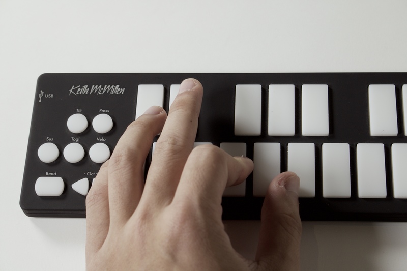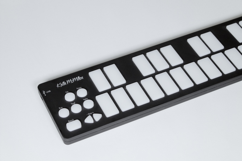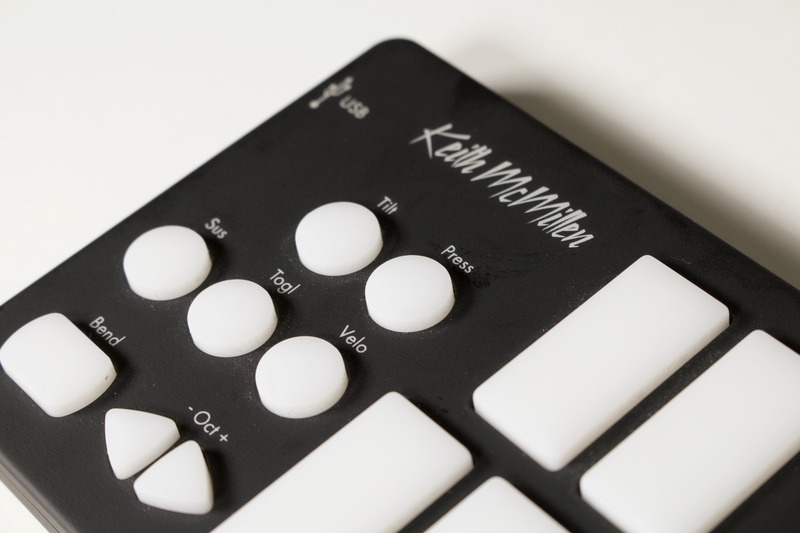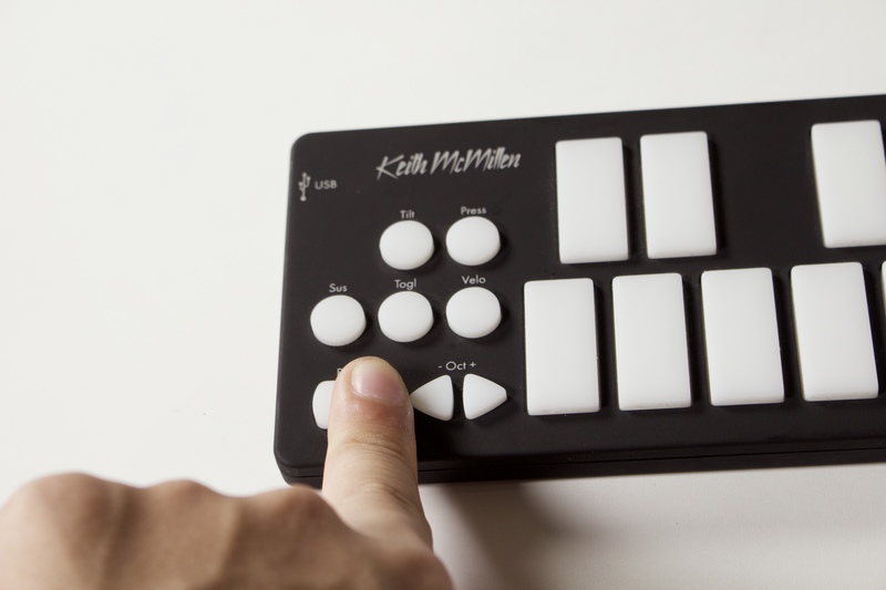 控制大約分成兩部份,右邊主要部份是 25 鍵鍵盤,黑白鍵都是使用相同的外觀設計,利用位置分配作為區別。左邊一小塊則是控制區:Tilt、Press、Sus、Togl、Velo、Bend,還有鍵盤 Octave 控制鈕。