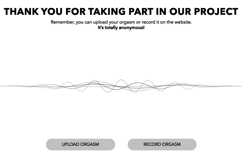 高潮聲音資料庫計畫,延續他們之前所做的調查,廣徵全世界各地的女性錄下自己的聲音,呈現出性的多樣性。你可以透過手機 App 或是網頁瀏覽器錄製 15-45 秒的聲音上傳到資料庫上,上傳的資料都是完全匿名的,所以不用擔心隱私權的問題。上傳後的聲音,還會依照聲音的特性,轉換成非常漂亮的另賴波型圖案,相當有趣。
