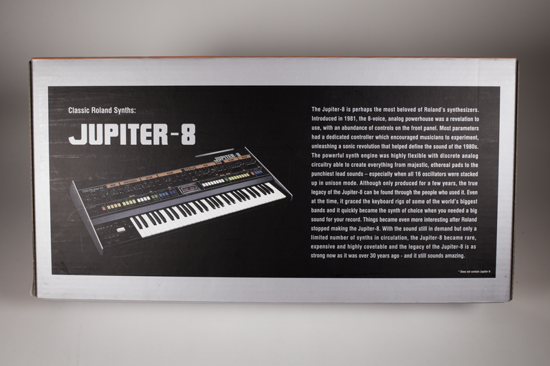 外盒正面的視覺設計相當簡單,背面則是貼了一個 Jupiter-8 的照片,同時也順便介紹這台經典合成器的生平。