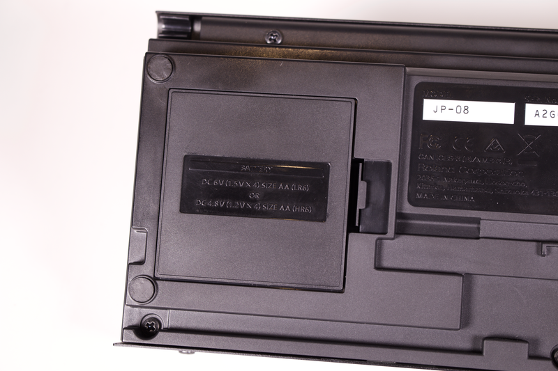 接著來看看背面,從右側可看到內建擴音器,而左下角則可看到電池槽,除了用 USB 以外你也可以用4顆AA電池作為供電的選項。