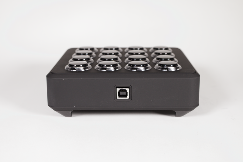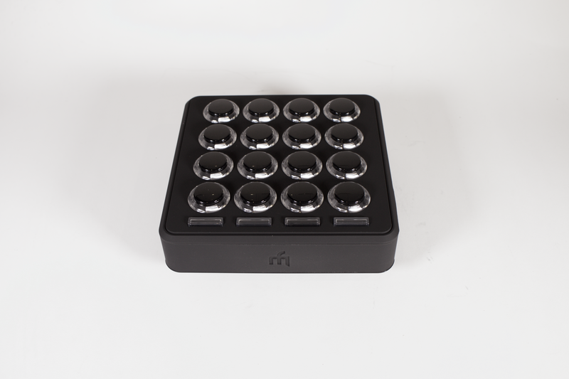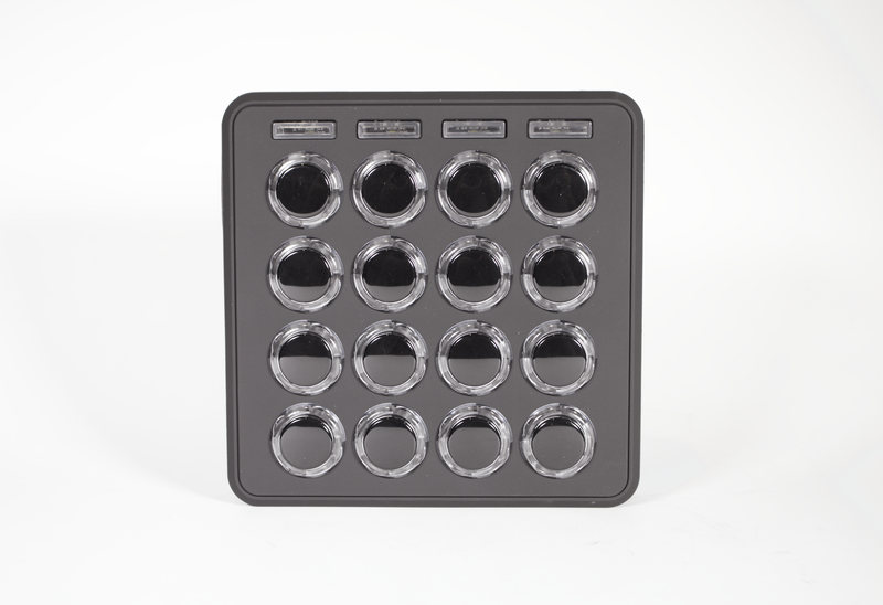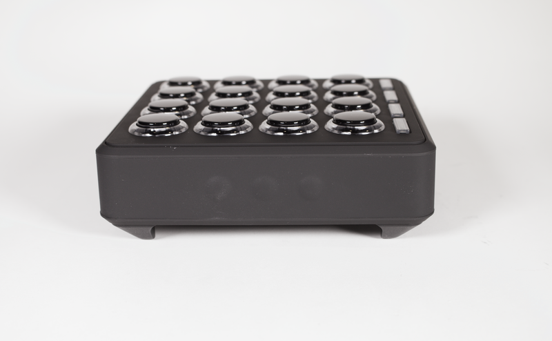 拿出來之後,可以看到正面的按紐設計,4 x 4 的圓形按鈕設計,上方的四個小長方形也是按鈕,可以用來切換儲存好的設定等等。