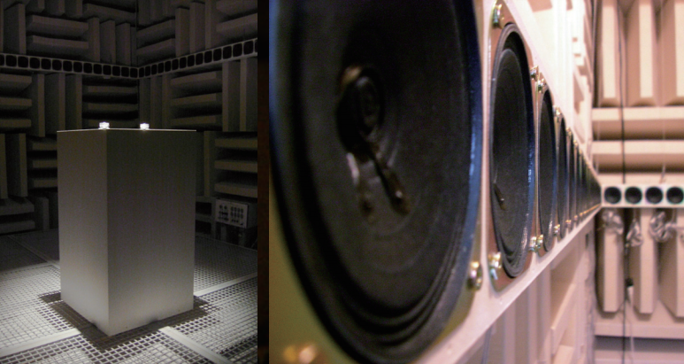 城:基本上,我們有個原則或者說是概念,舉例來說,每個參與者播放一個正弦波,然後他們像是合作一樣去共同呈現聲音作品。依照此概念,有些時候我們對計畫有不同的意見,但是至少我個人試圖從這個基本概念中保持作品的多樣性。起初,我們要求參與者要有一些對聲音的經驗以及程式概念,然後帶著他們的筆電參與,之後我們想開放給更多不了解正弦波是什麼、或是不懂程式的人參加,所以我們發展了自己的裝置,讓觀眾現場可以產生並撥放正弦波。舉例來說,在2005年於ICC[2],這計畫曾在開放自然 (Open Nature) 的展覽中呈現,我們設計了一個個系統去控制位置跟頻率,設置160個喇叭在展覽中,展覽環境在一個沒有殘響的房間,觀眾可以在房間中的位置去選擇聲音,最後將他們的正弦波停留在這個空間。剛開始展室沒有任何聲音,從第一個人進來增加一個波,接下來越來越多的正弦波產生,最後他們共同合作生成了聲音發表會。這計劃下一次將會在明年的山口情報中心(YCAM)展出。