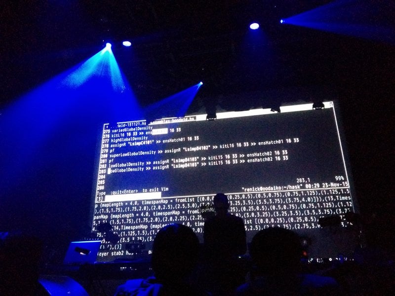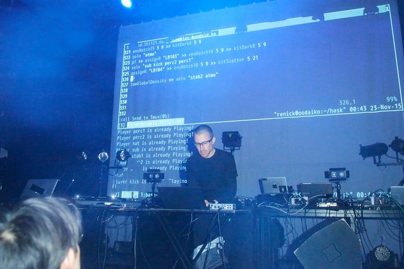 Bell: In 2005, I was seriously considering whether to pursue business or music. I felt I couldn't do both seriously at the same time, so I chose music. Then I started an online masters program in music technology at Indiana University, and I was studying a lot of things about computer music on my own. I used to play in hardcore punk bands doing really aggressive music, and it was live. When I got into computer music, I could do a lot of things in the studio or through processing sound on the computer, but I still wanted to do live music because I like the atmosphere of live performances. So I started using SuperCollider. I had used Csound and Pure Data, but I couldn't get the results I wanted. I began to write my own GUI-based software, but I was suddenly restricted to just clicking the mouse with one finger to control the software. When I played guitar, at least I had five fingers and a pick to control the sound. Compared to that, being able to use only one finger felt awful. In live coding, I can use all of my fingers. I'm pretty good at typing, so I could use that in SuperCollider before and now in Haskell. What's more important is that live coding uses words and symbols, but instruments like guitars and drums use gestures, or physical movements, to create sounds. In live coding, being able to control a lot of things using those symbols and presenting that code on the screen is important. In 2007 I moved from making GUI-based software to live coding in SuperCollider and then Haskell in 2011. It's been nearly 10 years now. I still use the SuperCollider synthesizer, but most of my coding is in the Haskell language. It's been that way for the past five years.