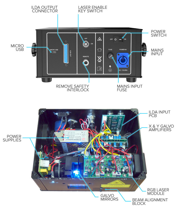 LaserDock 整合了雷射投影機、音樂視覺產生器與雷射演出的軟體,因此能在各地快速連結 MAC、PC 或是行動裝置開始雷射演出。雷射影像範圍為 2 到 3.3 平方公尺、3 到 5 公尺的投影範圍。