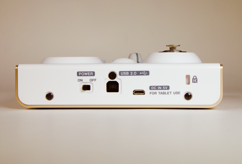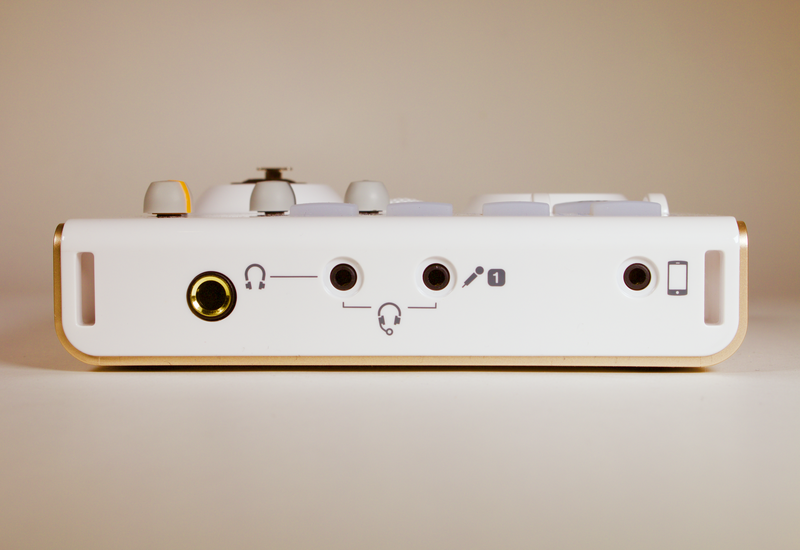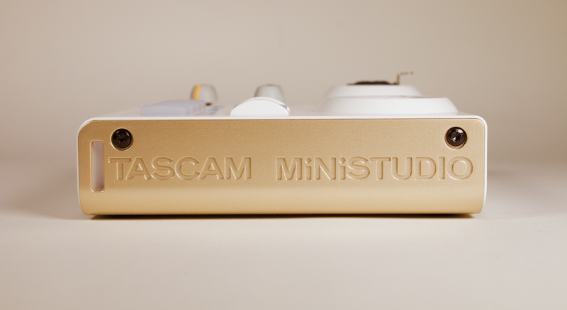 有別於大部分的介面,Tascam US-32 使用白色與香檳金的配色,而且是塑膠外殼,相當的輕(不到四百公克!),兩側也有兩個小掛孔可以接上背帶使用。