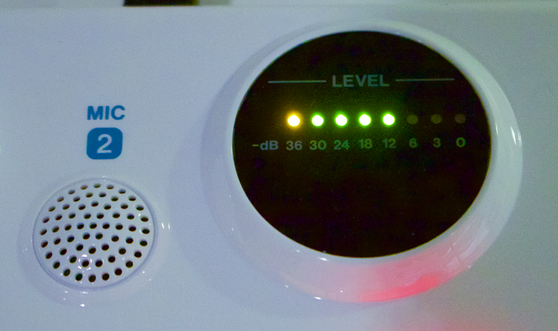 左上有一個輸入孔(6.3 或 XLR)可以外接麥克風或其他的樂器,右上有個顯示音量的量表,而各個旋鈕和按鈕的配置都蠻剛好的,不用怕不小心碰到旁邊的,轉起來和按起來也都相當舒服。
