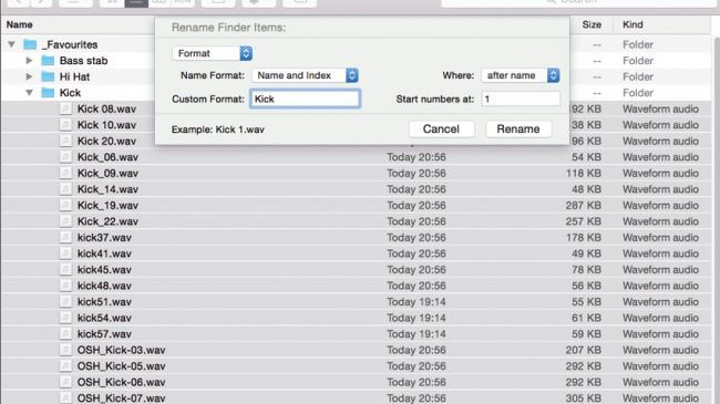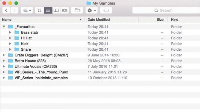 第一步:若是要從 sample 包中瀏覽你要的 sample 要花不少時間,但你可以將最常用、最喜歡的整理成單一一個資料夾。創立一個資料夾叫「_Favourites」,前面的底線是為了確保它保持在最上方,使你可以快速找到,並在這資料夾之下創立各分類(Kick,Snare,Bass 等)。