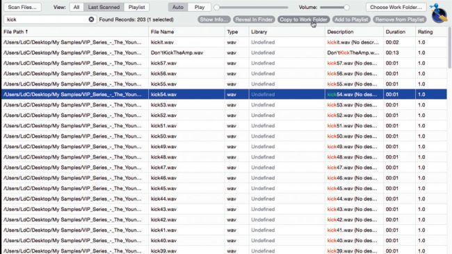 第二步:你可以手動的將你最喜歡的 sample 丟到這資料夾中,我們建議你可以使用免費且跨平台的軟體 MetaDigger。再輸入 kick 時,我們會將 “Work Folder” 設定為 _Favourites/Kick,然後 ”Scan File“ 主要的 sample 資料夾。當這些步驟完成,我們只要尋找 “kick” 並將喜歡的點選 “Copy To Work Folder”,就能納入 “_Favourites” 資料夾中。