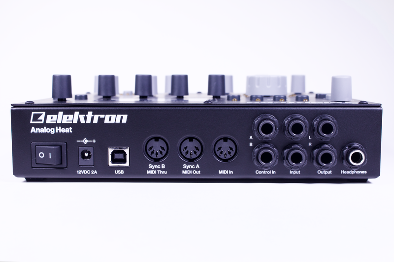 連接部分,可以透過 USB 做 MIDI 與傳送,並使用 Elektron 獨家的 overbridge 技術,來利用 vst 控制機器本體,還能拿來當作一台二進二出的 48 kHz, 24-bit 錄音介面,這一點對於電子音樂人相當有利,擁有 Analog Heat 代表你的現場演出可以少帶一台錄音介面來做電腦聲音輸出。三個傳統的 MIDI in/out/thru 來做 sync 與 MIDI 控制,擁有兩個聲道聲音輸入與輸出一個耳機監聽,是一台雙聲道的聲音處理器。兩個輸入控制可以連接各式控制裝置如表情踏板、切換踏板、CV 等...。